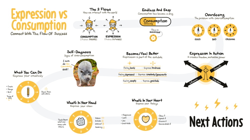 - Idea 3: Expression vs Consumption - There are two main ways you interact with the world around you. They’re both useful and needed, but one creates a powerful momentum in your life to achieve what you want. In this lesson I’m going to show you how to create the spark to ignite this momentum.